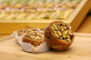 Eine syrische Süßspeisenspezialität aus feinstem Kunafa-Teig mit cremiger Pistazienfüllung. Ihre einzigartige runde Form und die besondere Textur machen sie zu etwas ganz Besonderem. Frisch und handgemacht nach traditionellem Rezept.